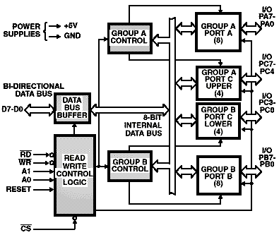 - One 8 bit bi-directional bus port (Port A) and one 5 bit control port (Port C)