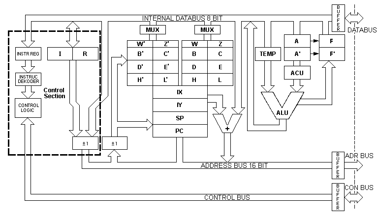 Another aspect in processor- architecture are the number of internal registers, and if they are dedicated to special purposes. The Z80 CPU internal organization is made visible on the figure below: