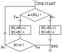 Flags: CY Z PV S N H . ~ ~ ~ 1 ~ (~ = changes, . = no change) And the flags: if byte found: Z=1; HL - address of next byte; BC - figure out by yourself. not found: Z=0